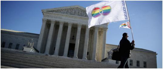 WASHINGTON, DC – JANUARY 09: Pete Prete of Equality Beyond Gender holds a ‘marriage pride flag’ outside the U.S. Supreme Court January 9, 2015 in Washington, DC. The justices of the Supreme Court were scheduled to meet to determine whether the court will take up any of the five pending state-banned same-sex marriage cases in Ohio, Tennessee, Michigan, Kentucky and Louisiana. (Photo by Alex Wong/Getty Images) | Alex Wong via Getty Images