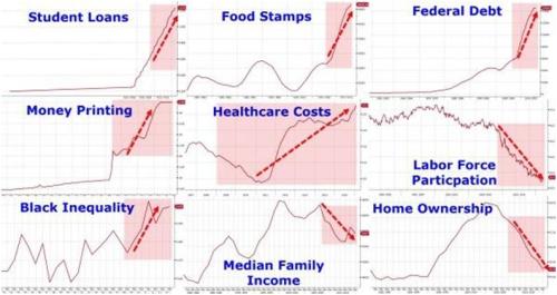 Things that should be going up in a healthy economy – Labor Force Participation Rate, Median Family Income, Home Ownership – are all going dramatically down. Those items that one would expect to see going down if the economy really were as good as The-Powers-That-Be tell us – Food Stamps, Federal Debt, Money Printing, Healthcare Costs – are going straight up.