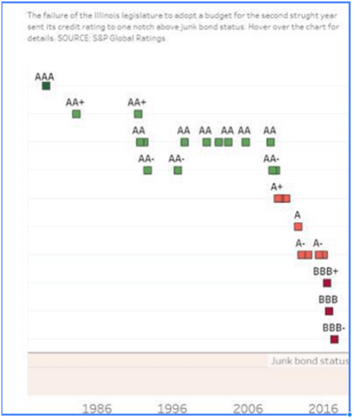 One suspects that the same could be said by many who have found themselves in financial difficulty. And from the chart of Illinois bond rating below, that same pattern appears to hold in the case of Illinois.