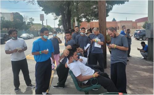 A group of migrants from Venezuela planned their next steps at the Downtown El Paso Greyhound station after they were released to the streets as part of an effort by the Border Patrol to control the population at its El Paso Central Processing Center. The men gave their consent to be photographed. (Cindy Ramirez/El Paso Matters)