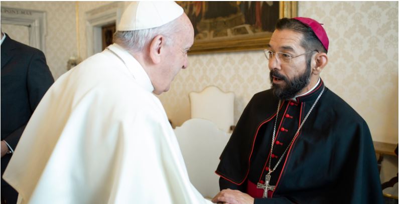 Diocese of Brownsville Bishop Daniel Flores meets with Jesuit Antichrist Pope Francis during a Jan. 20, 2020, meeting with U.S. bishops from Arkansas, Oklahoma and Texas during their “ad limina” visits to the Vatican. (Credit: CNS photo/Vatican Media)