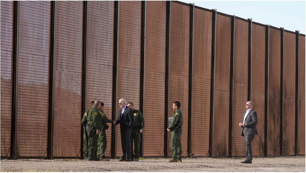 Joe Biden greets U.S. Border Patrol agents along a stretch of the U.S.-Mexico border in El Paso Texas, Sunday, Jan. 8, 2023. (AP Photo/Andrew Harnik)
