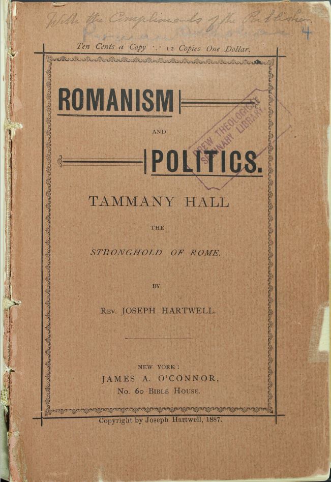 “TAMMANY HALL is simply the political organization of the ROMAN CATHOLIC CHURCH, with a Bishop Hughes or a Cardinal McCloskey or Archbishop Corrigan at its head and a Fernando Wood, a William Tweed, or a John Kelly for his fugleman [mouthpiece, author]. The proper name for it is JESUIT HALL. By this name it should be called, and by none other; for name and nature should correspond, so that when the one is called the other should be understood, and that would help to guide both the mind and the action of the American people.”