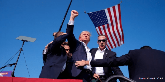Donald Trump being ushered off stage by the Secret Service after an assassination attempt at his rally in Pennsylvania, July 13, 2024.