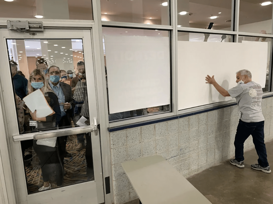 Windows being covered outside of the room where absentee ballots are being counted at the TCF Center in Detroit, November 3, 2020. Kimberly P. Mitchell/USA Today Network/Reuters
