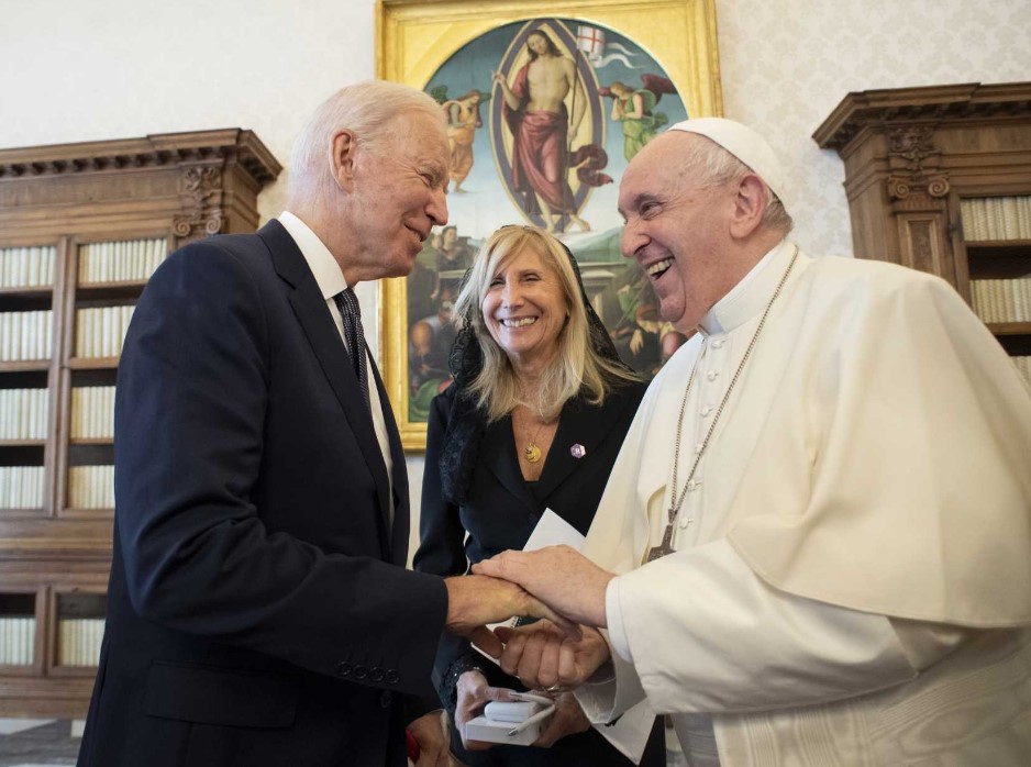 U.S. President “Jesuit” Joe Biden greets Pope Francis during a meeting at the Vatican Oct. 29, 2021. Biden, the nation’s second Catholic president, spent 75 minutes talking to the Papal Antichrist privately. (CNS photo/Vatican Media)